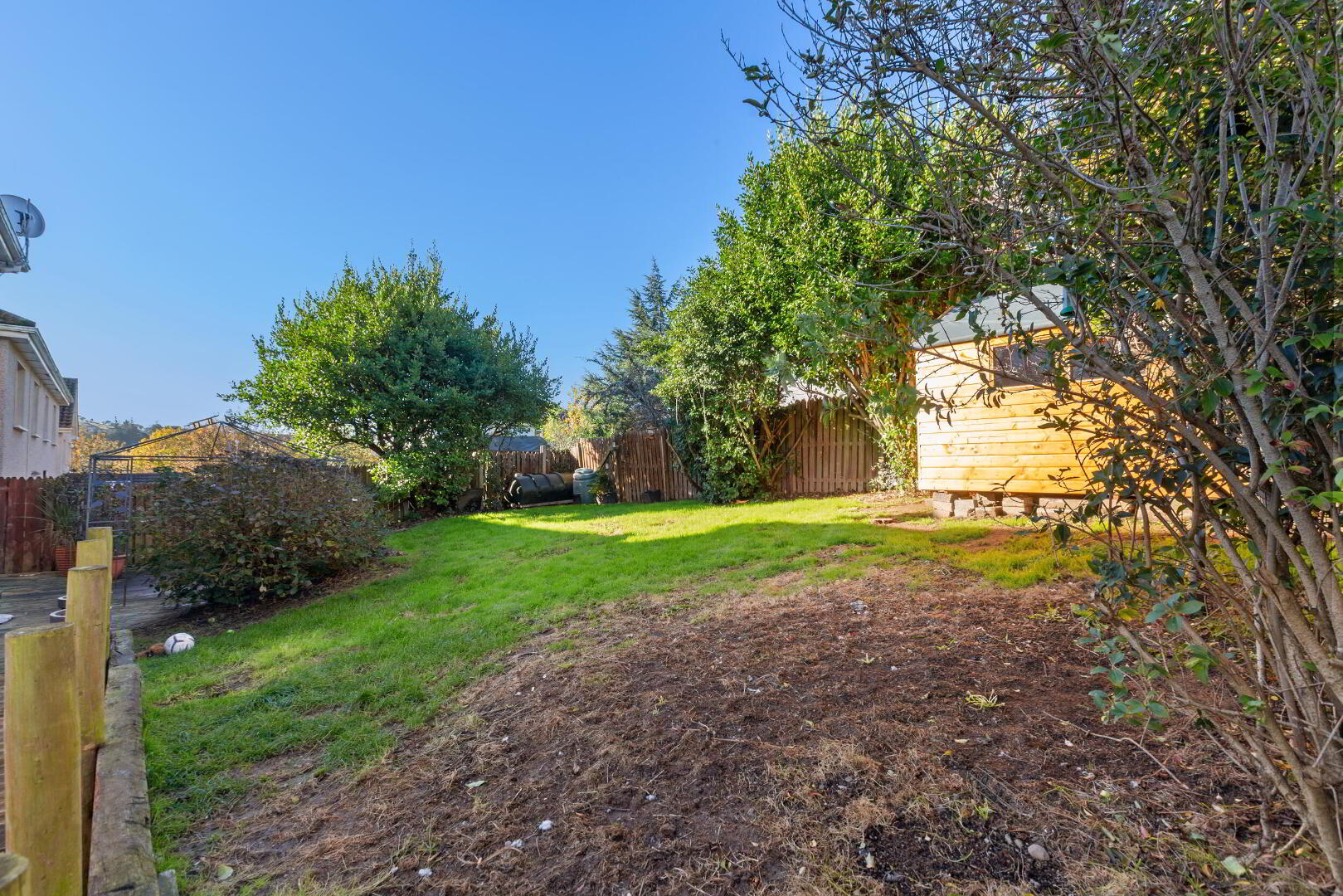 Low maintenance south facing rear garden with decking area, large space to the side, Ideal space for entertaining or extending (STPP) the gardens are mainly in lawn and surrounded by selection of plants, shrubs, and trees. New Garden shed with power. Gated side entrance and outside tap.