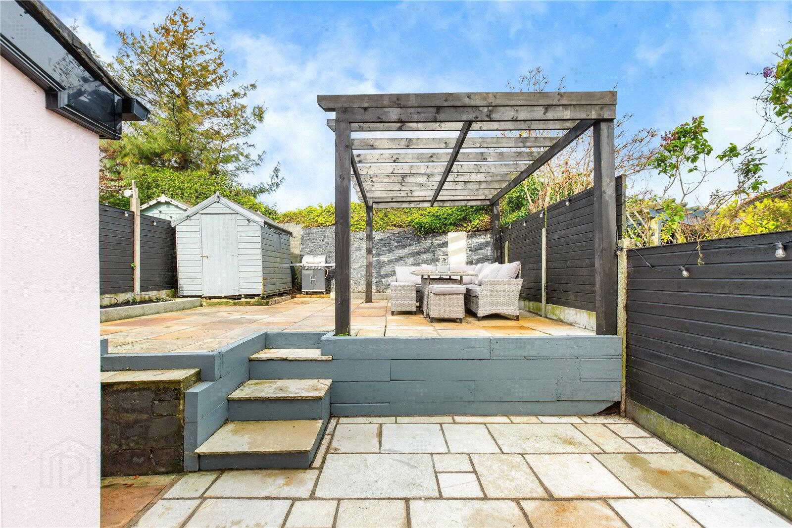 Outside, the rear garden is designed for ease of use and enjoyment. A paved patio area leads up via steps to a raised seating area with a pergola, creating an ideal setting for outdoor dining and relaxing.