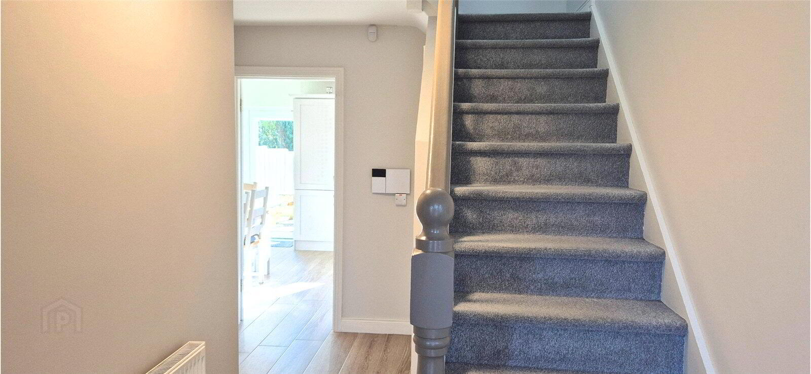 - Open the sleek, glazed front door to a bright hall with wood-effect flooring and a grey-carpeted staircase edged in crisp white. Neutral tones and discreet storage make a polished first impression.