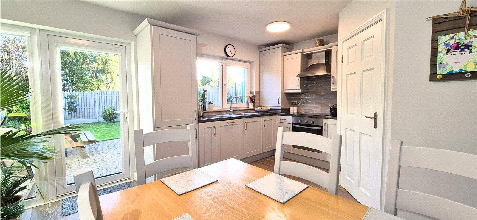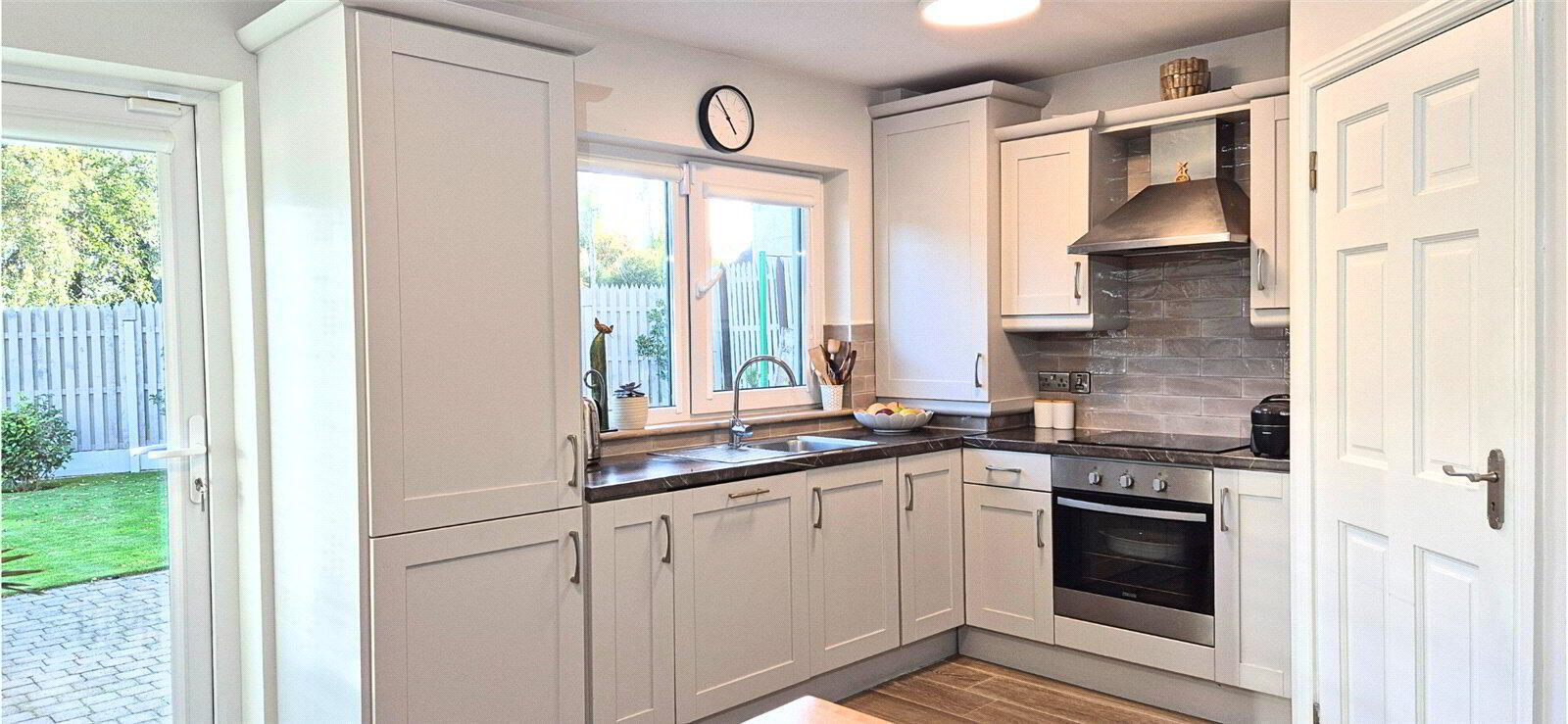 - This contemporary kitchen is designed for both style and functionality, featuring sleek painted shaker cabinets, dark countertops and a chic tile splashback, with integrated appliances including, ceramic hob, oven, fridge freezer and a stainless-steel cooker hood. A large window over the sink and glazed doors from dining area to the garden flood the space with natural light and invite effortless indoor outdoor living.