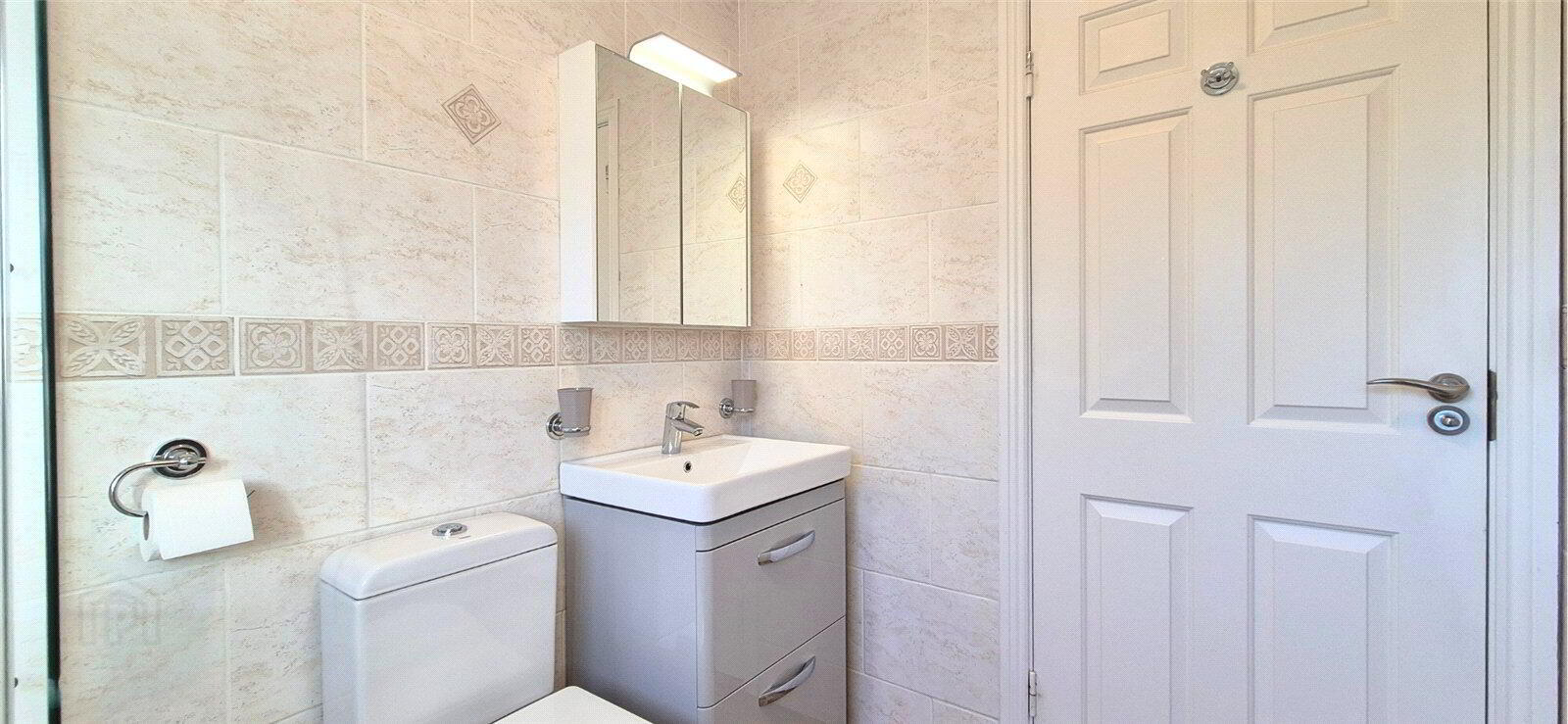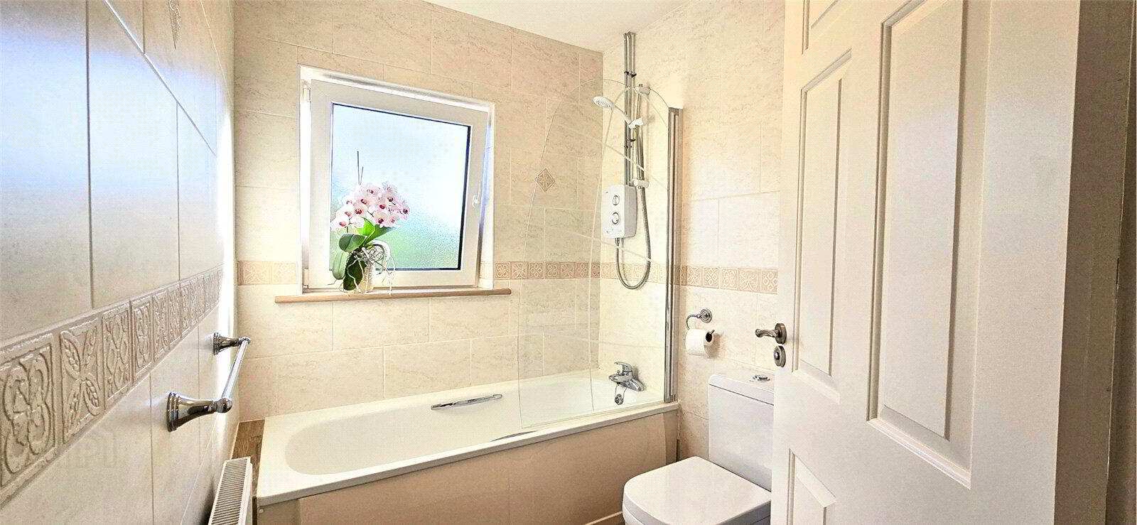 - The family bathroom is fully tiled in neutral tones, featuring a contemporary white suite with a sleek vanity unit and mirrored storage. A frosted window bathes the space in natural light while maintaining privacy, and the bath is fitted with a Triton electric shower and curved glass screen, accented by chrome fixtures for a modern finish.