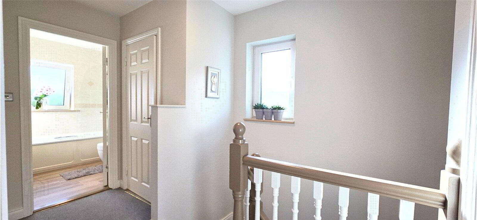 - The upstairs landing is bright and airy, finished in soft neutral tones and carpeted for comfort. A large window fills the space with natural light, and the refined balustrade neatly frames the stairwell, with doors leading off to the bedrooms and family bathroom.