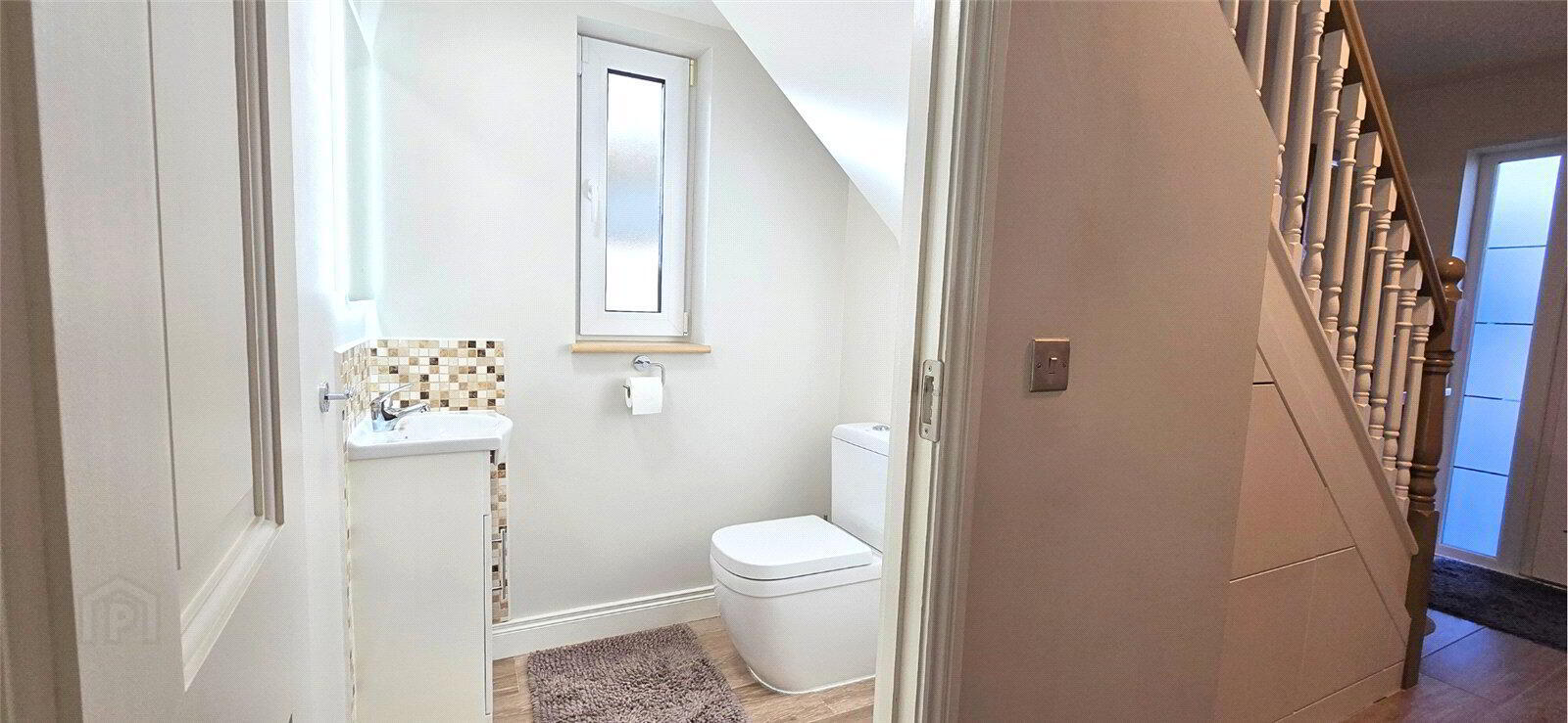 - A well-designed storage drawers tucked discreetly beneath the staircase, finished in soft neutral tones with a warm timber-effect floor. It features a sleek, wall-mounted vanity with mosaic tile detailing and a contemporary WC, complemented by a frosted window that allows natural light and ventilation while maintaining privacy.
